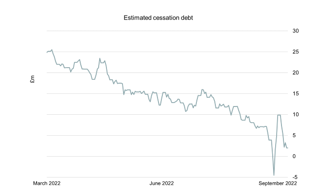 Similarly, the below chart shows how the estimated exit debt for a not-for-profit organisation in one of the LGPS funds has fallen from £25m to almost £nil over the last six months: